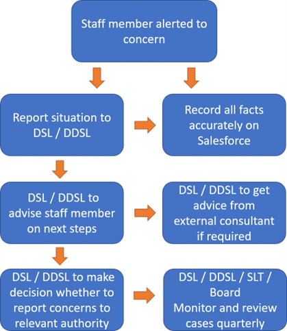 The DSL/DDSL will make a decision on whether to refer the matter onto the relevant Children’s Services Department and/or the Police. Referrals should preferably be made within the same working day and certainly within 24 hours. If you have concerns about someone over 18 then you should discuss these with the MD in the first instance.
